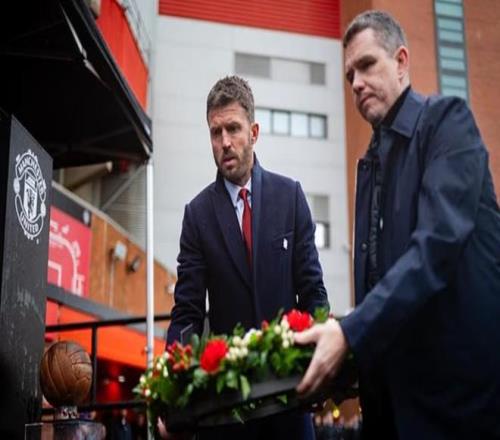 主教练迈克尔-卡里克与女足主帅马克-斯金纳,在慕尼黑时钟下摆上花圈,随后队长布鲁诺-费尔南德斯与玛雅-勒-蒂西耶也依次献花,全场肃立默哀。