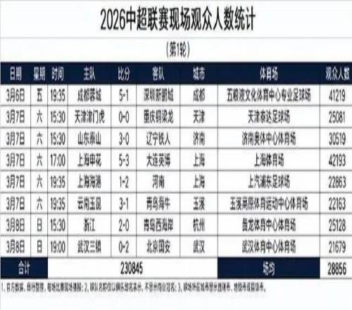 2026中超首轮战罢,一个数字让所有关心中超的人松了口气:场均28856人。8场比赛,总计230845名球迷走进球场,没有一场观众低于两万人。这个近2.9万人的场均数据,放在最近几年的联赛环境里,称得上是一个暖意十足的开局。